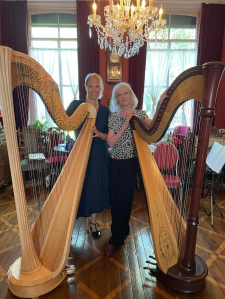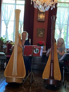 In de pauze bekeken de belangstellenden de indrukwekkende pedaalharpen en gaven Jopie en Inge de nodige uitleg. Het weer was dermate prachtig dat de meeste mensen de koelte van het pand opzochten.