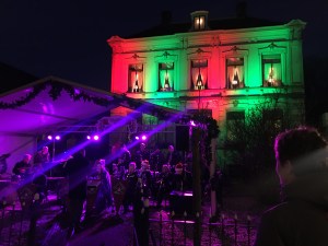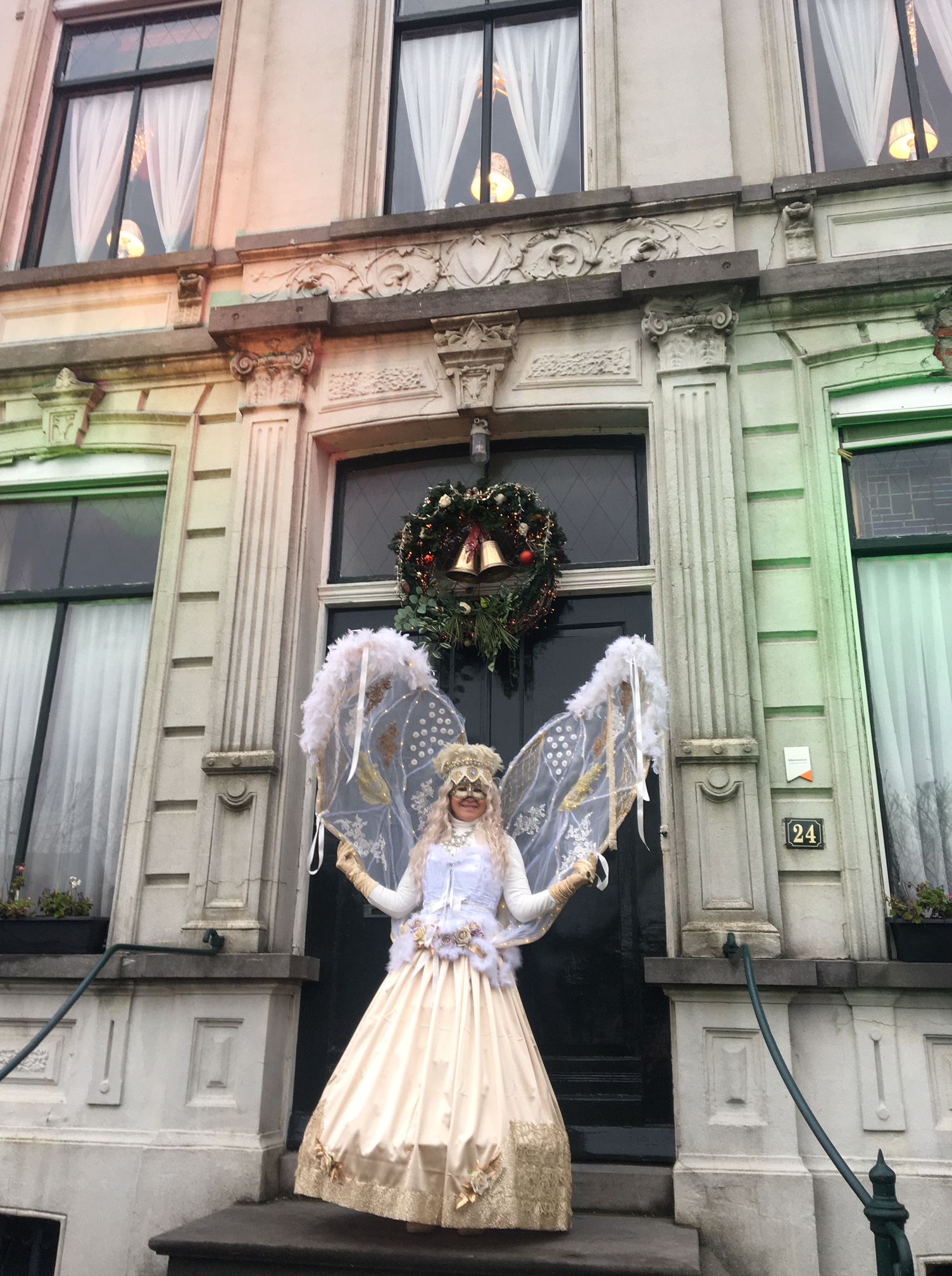 De Parel Vocal Group ging dat een uur later met een grotere groep wat gemakkelijker af en ondertussen poseerde een prachtige kerstengel op het bordes van het statige pand, dat naarmate het donkerder werd steeds sfeervoller in de schijnwerpers kwam te staan.